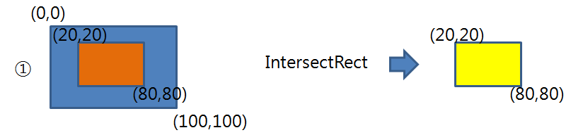 IntersectRect 함수는 두 개의 파라미터를 필요로 하는데, 이 중 앞의 파라미터로 전달된 CRect 영역과 뒤의 파라미터로 전달된 CRect 영역이 교차되는 영역을 구한다.