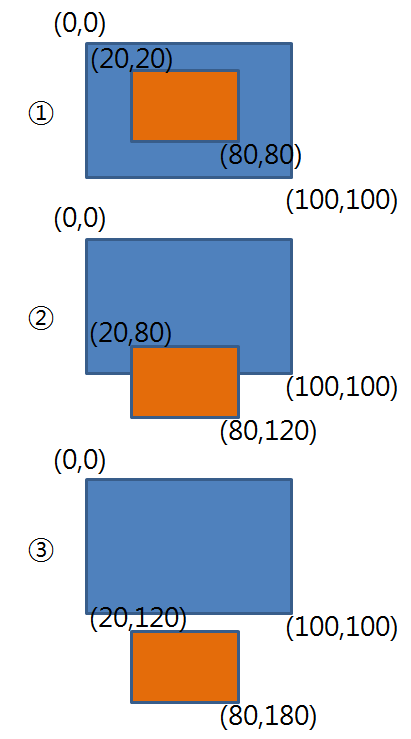다음 세 가지 케이스는 IntersectRect 의 동작을 확인하기 위한 케이스이다.